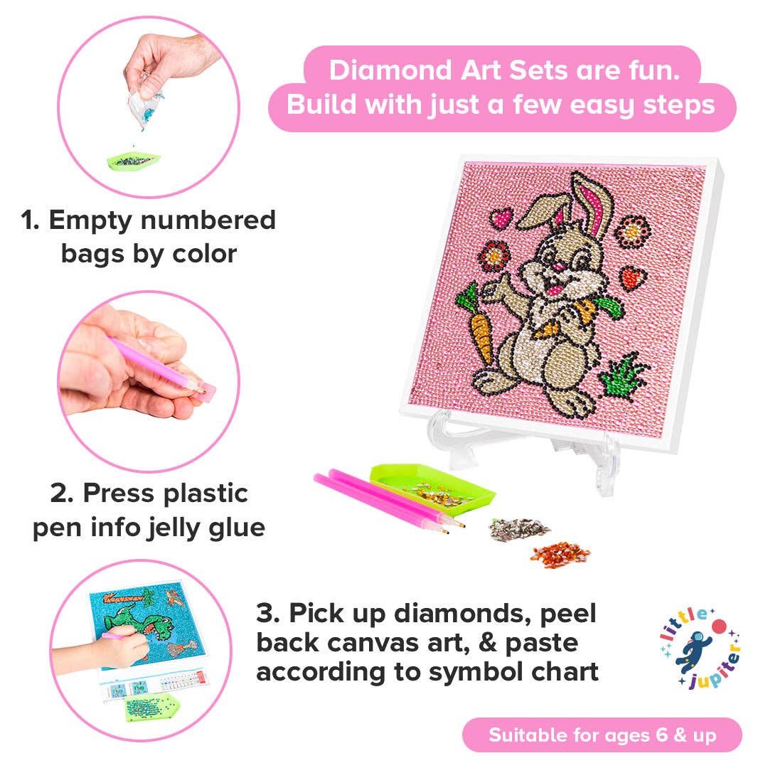 Are you looking for a great way for kids to pass the time? Perhaps something that unlocks a child’s creativity? Rainy day project that requires focus? A gift? Look no further than the Little Jupiter Rabbit Diamond Art Set. A wooden canvas art set similar to paint by number projects. The perfect beginner set for kids 6 years and up. The average build time is 2-4 hours. Kids will love the end result of their hard work.