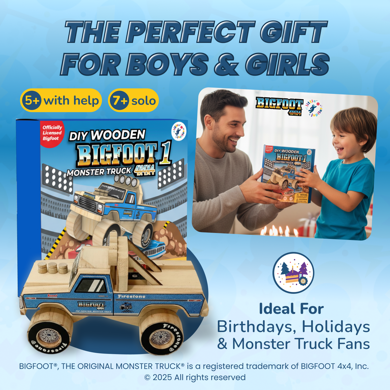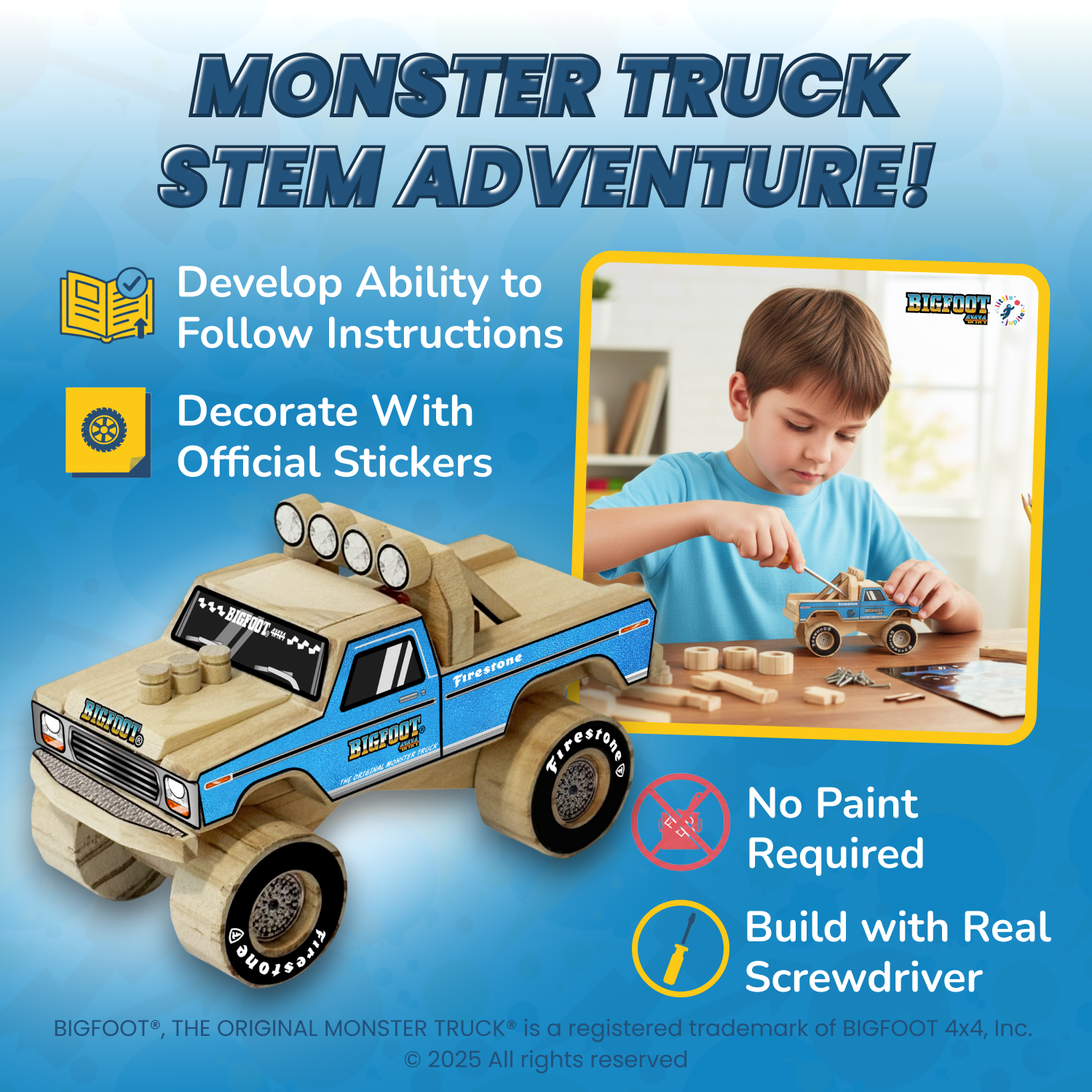 This officially licensed Bigfoot product includes precut wooden parts, child-safe screws, a real screwdriver, and authentic Bigfoot decals so the finished truck mirrors the classic design collectors and parents remember from their childhood. After assembly, the truck features rolling wheels perfect for reenacting the iconic car-crushing shows that made Bigfoot a worldwide phenomenon.