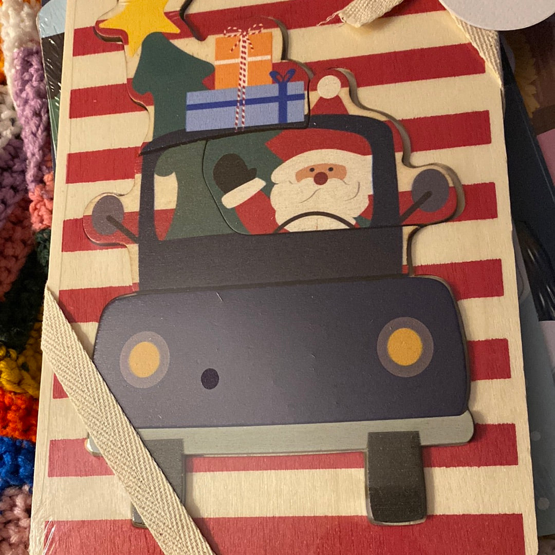 • Looking for an easy kids Christmas gift? Pick up our wood car Santa puzzle. The wood puzzle measures 8 3/4" x 6". The puzzle features pieces that make up an image of Santa in a car. The car has a Christmas tree and presents in it. This puzzle is intended for ages 3 and up.