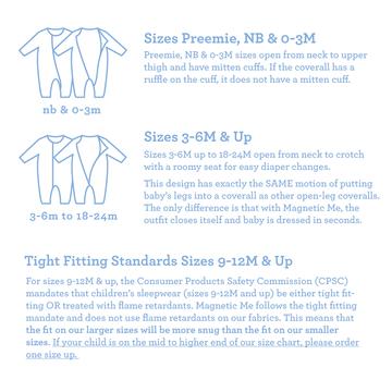 *NB & 3M sizes open from neck to upper thigh and have mitten cuffs. *6M-24M sizes open from neck to crotch with a roomy seat for easy diaper changes. *9-12M sizes & up follow tight-fitting standards and are meant to be snug. Order one size up if your child is on the mid to high end of our size chart.