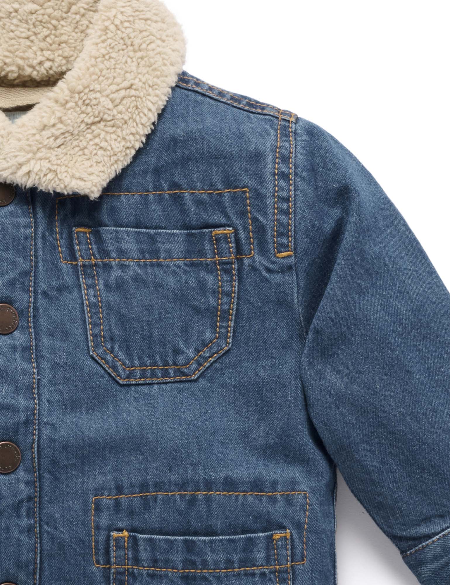 Keep your little one warm and snug in our stylish Denim Shearling Jacket! Featuring a cozy faux shearling collar and lining, contrast stitching and metal snap buttons. Made from soft 100% Cotton denim in a dark wash. This is the perfect layering piece for all year round.   Front pockets Metal logo, snap buttons Faux shearling collar.