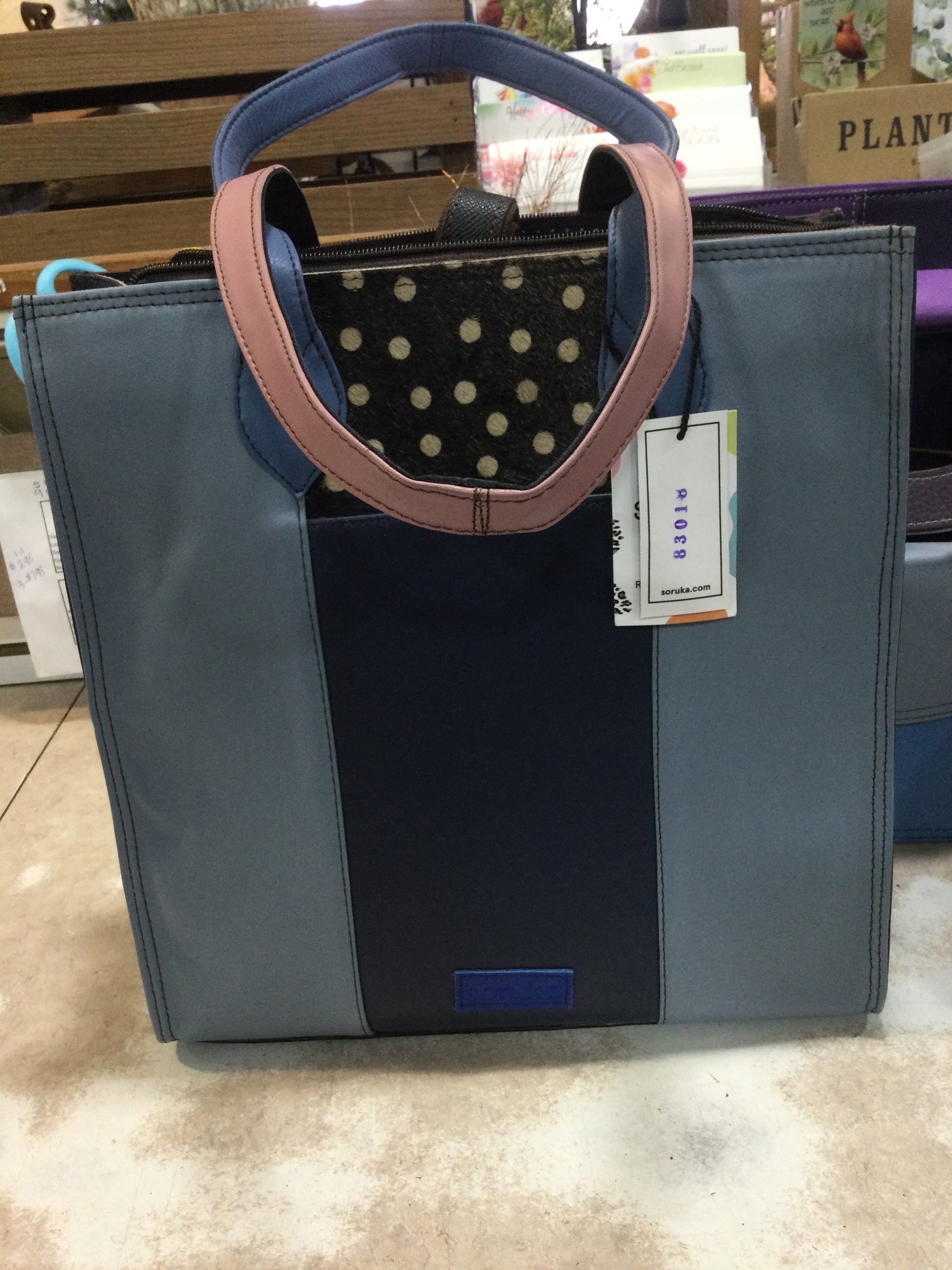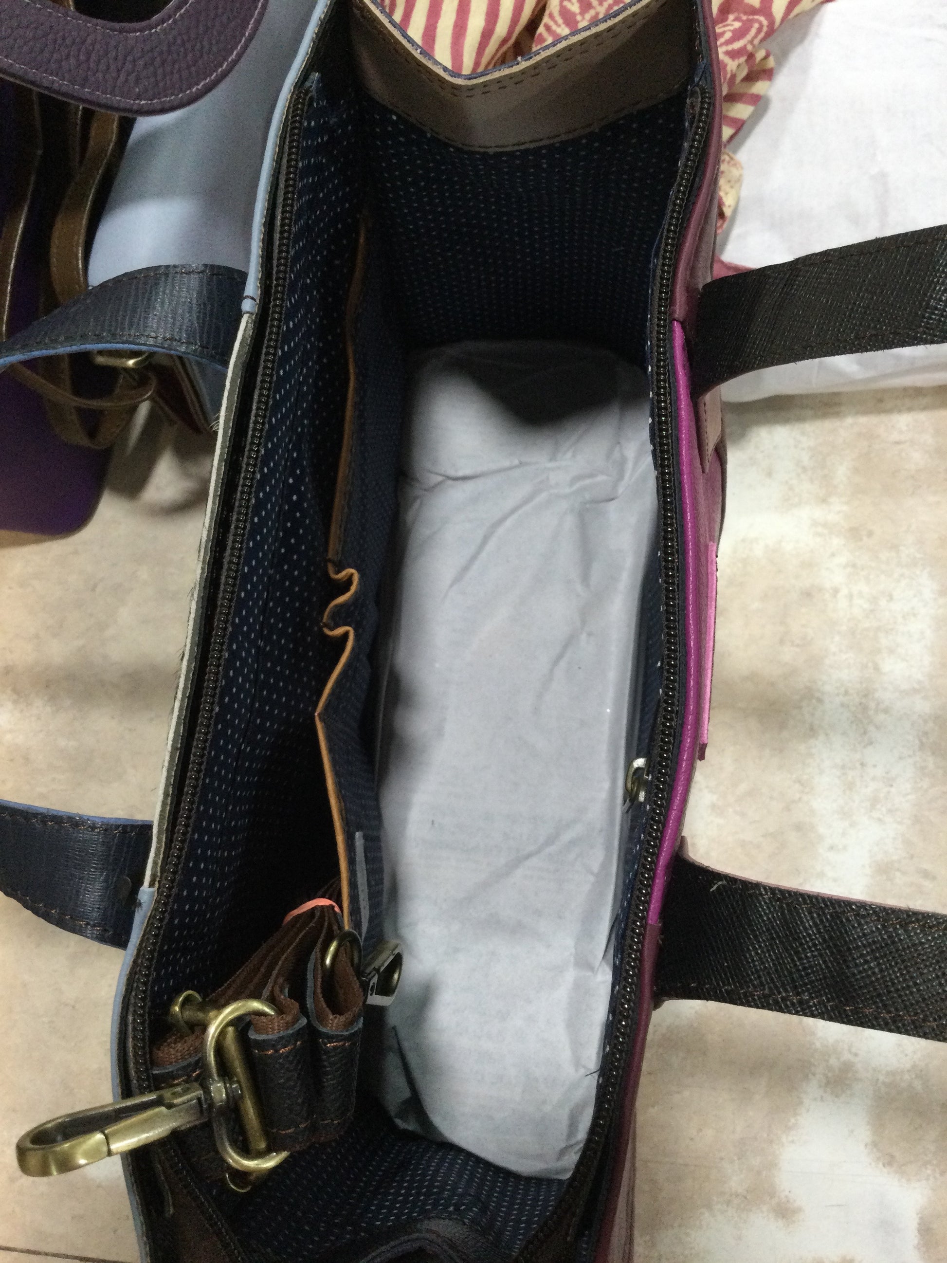 Large shoulder bag that will not disappoint.  2 slide-in pockets and 2 pen pockets on one side. The other side has one large zipper pocket. Shoulder strap included if you prefer to use it.