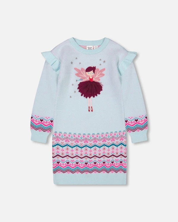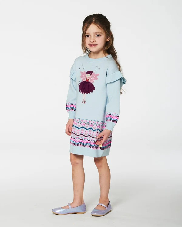 Make chilly days as sweet as can be with our Intarsia Knit Dress Light Blue. This adorable sweater dress features distinctive details, including ruffles on the sleeves, a fairy princess on the chest, and a colorful fairisle pattern at the wrist and hem. Finished with a round neckline and rib knit trim, this dress is perfect for wearing on its own or layering over tights or leggings.
