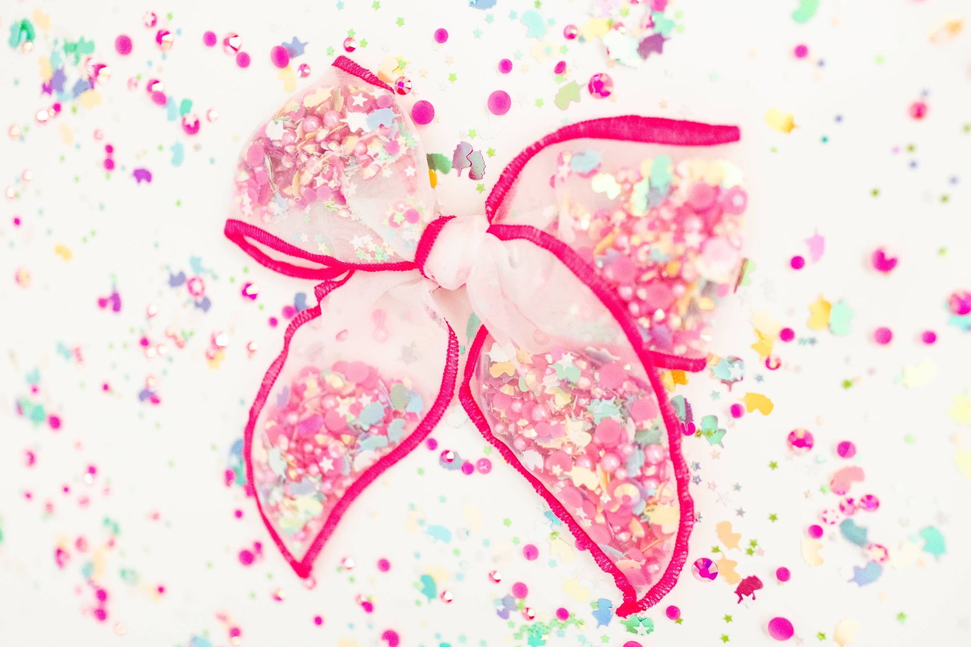 Add sweetness and sparkle to your outfit with this Pretty in Pink Mesh Shaker Bow! Glimmering with girly confetti, this bow adds a pop of color and delightful detail to your look! (And it feels oh-so-fun to shake!) Adorned with unicorn confetti