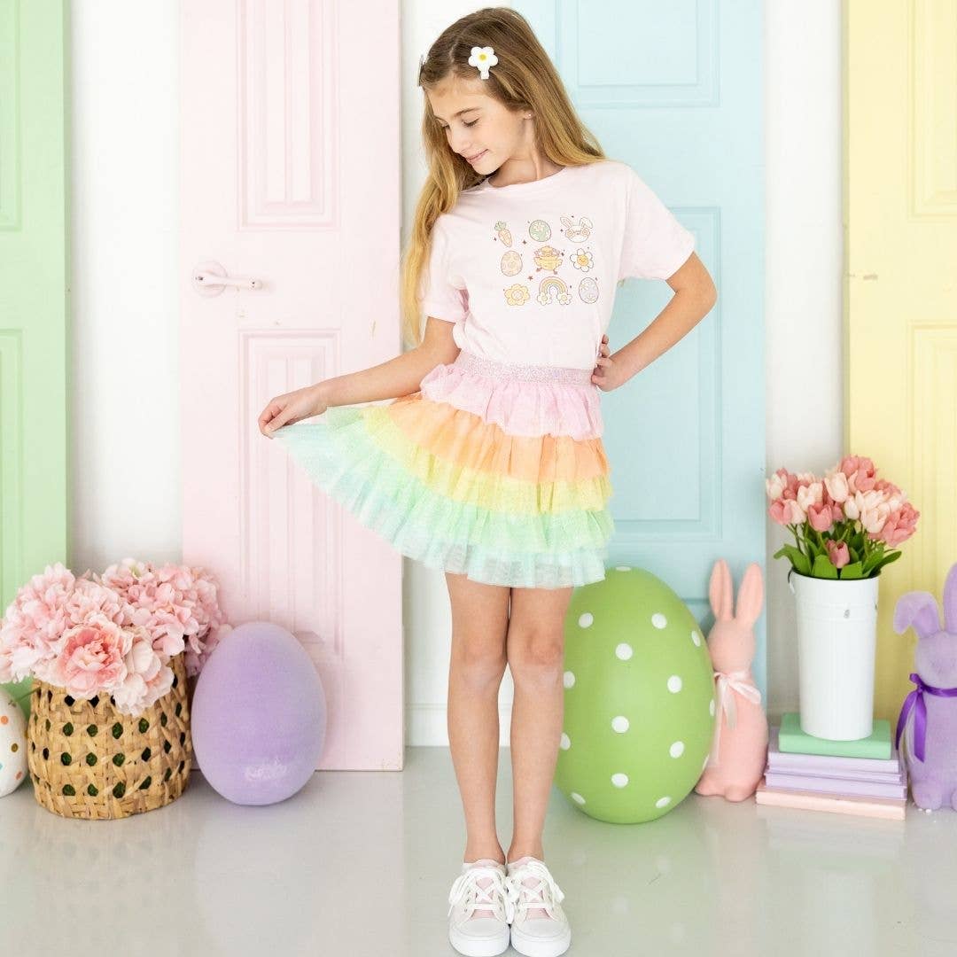 The Pastel Petal Tutu is a fun skirt and dress up tutu for celebrating birthdays, holidays or any day! Features: * Multicolor pastel glitter tulle accented with gold glitter pin dots * White cotton lining * Pink glitter waistband * Care: Hand wash and line dry The Sweet Wink difference: * Super soft tulle that doesn’t scratch or itch * Cotton lining provides extra coverage and comfort * “Shed-free” embellishments ensure glitter does not sprinkle around the house