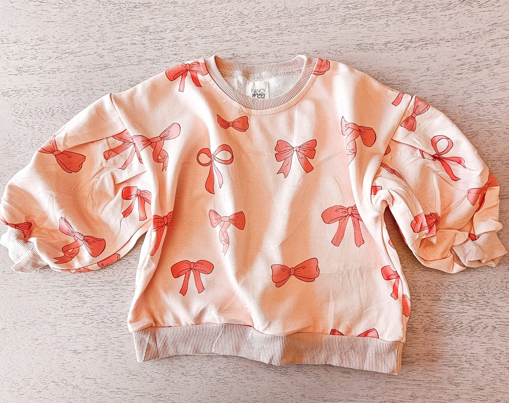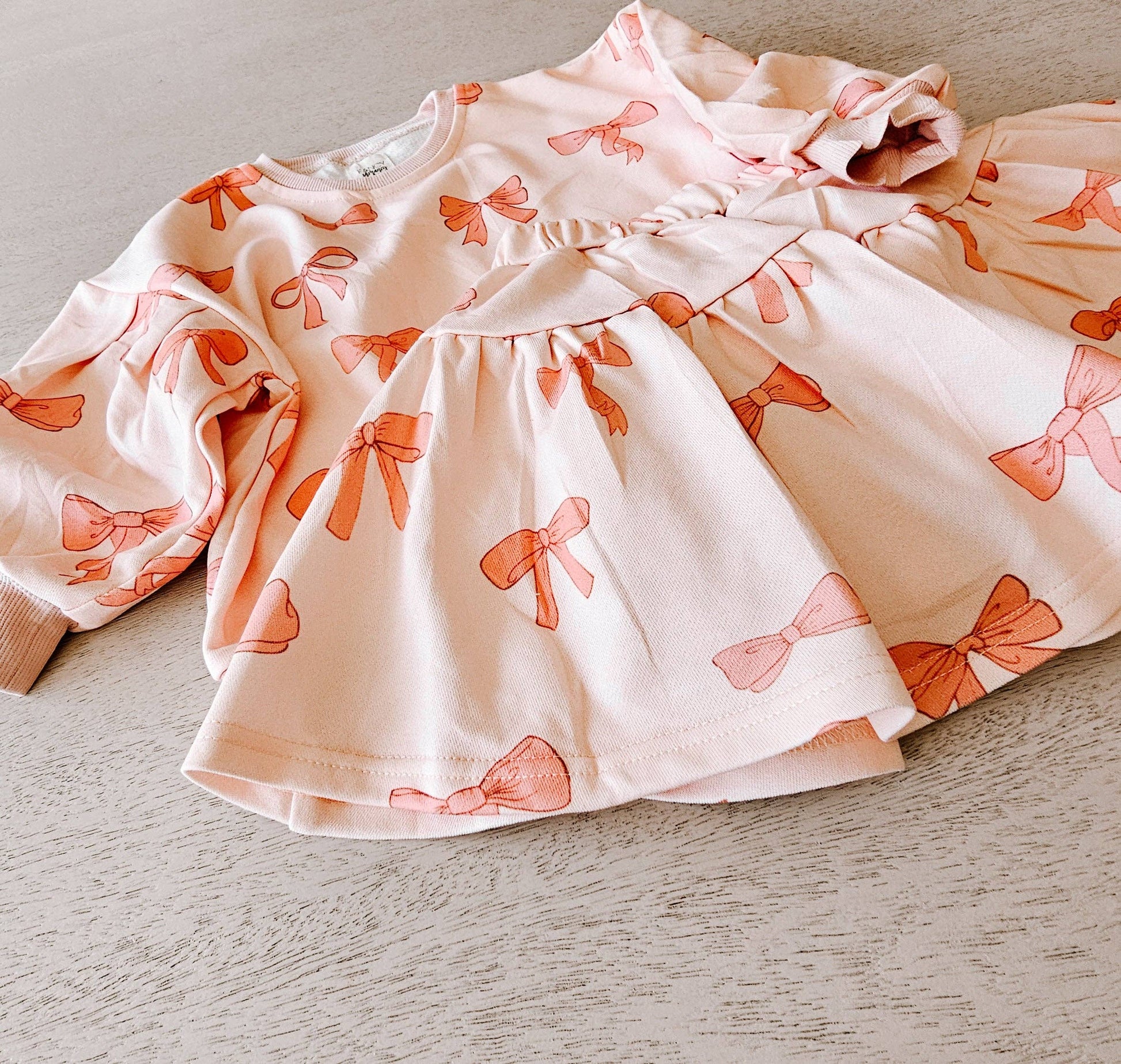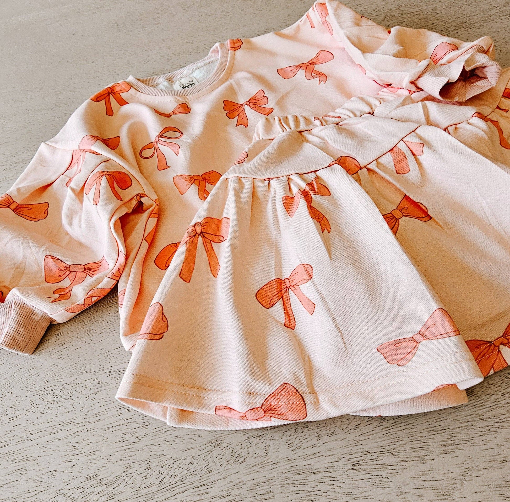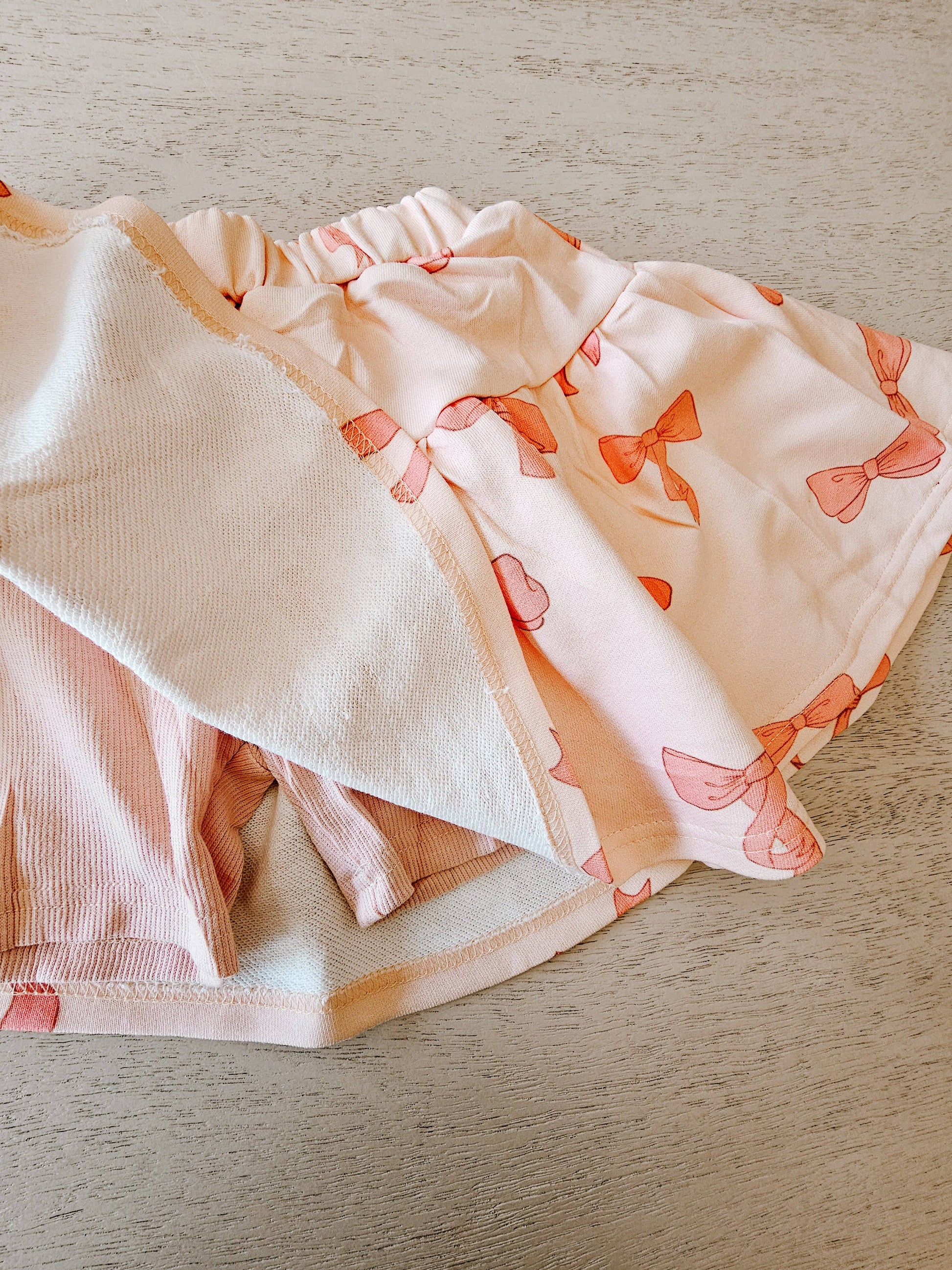 French terry drop shoulder sweatshirt with matching flounce skirt. The skort has bike shorts attached underneath so your little one can play comfortably all day.
