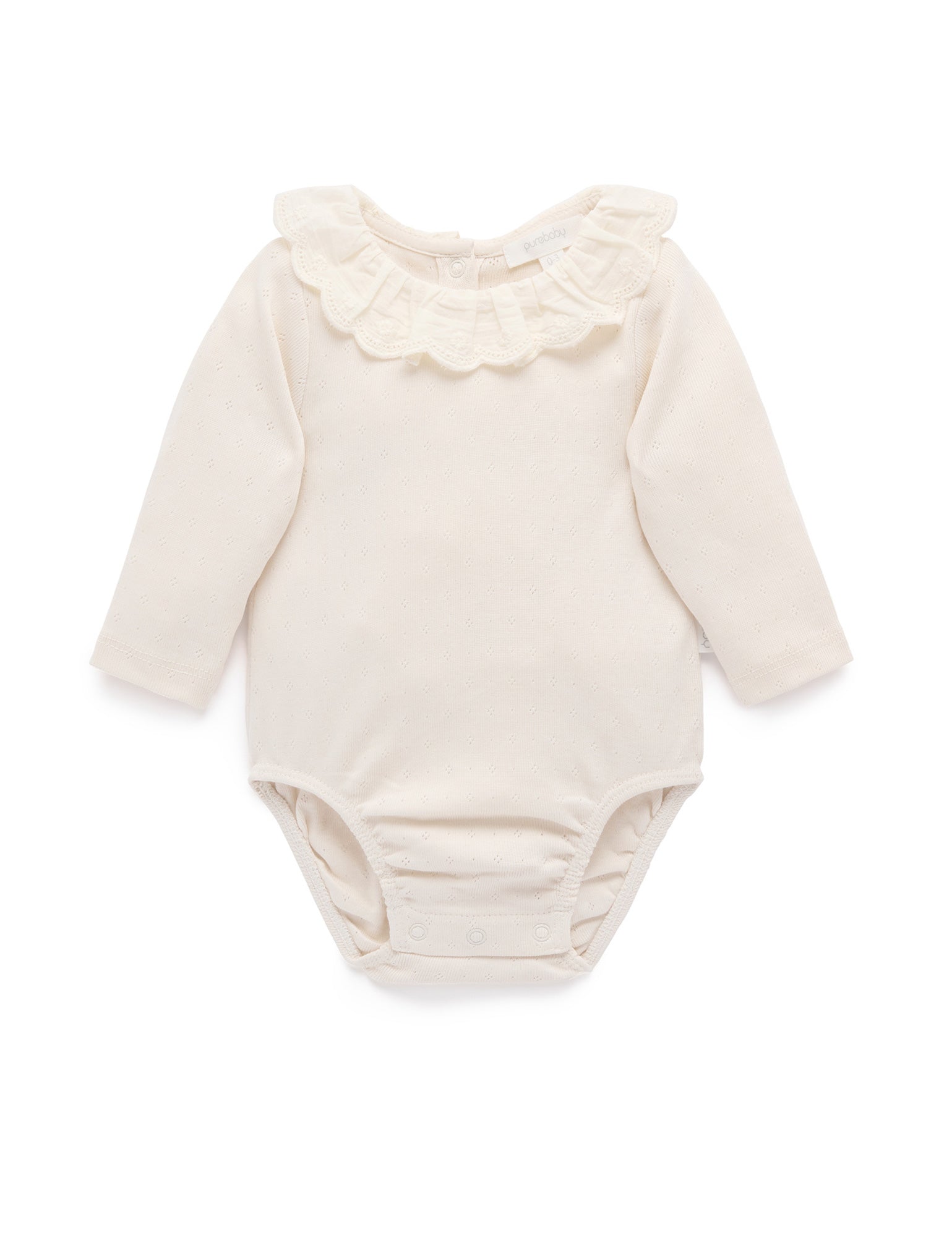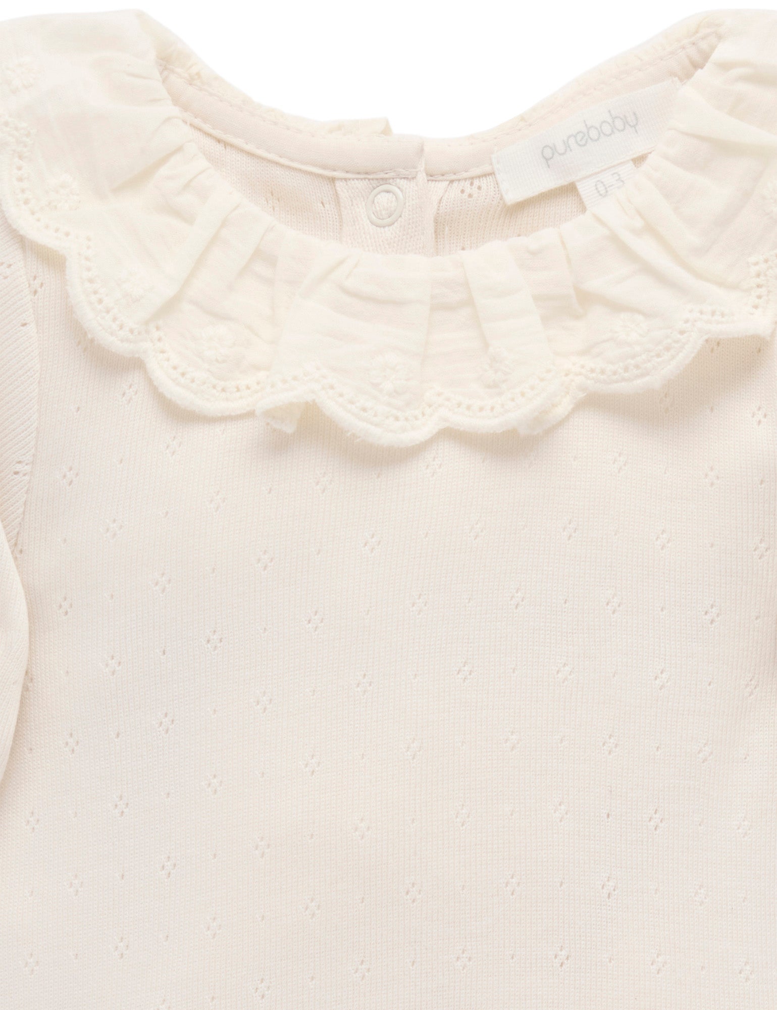 Our Ruffle Pointelle Bodysuit is a pretty piece to add to her winter layering wardrobe. Featuring a sweet, scalloped ruffle detail at the neck and snap clips at the leg and back for easy dressing. Made from the softest 100% Organic Cotton pointelle.