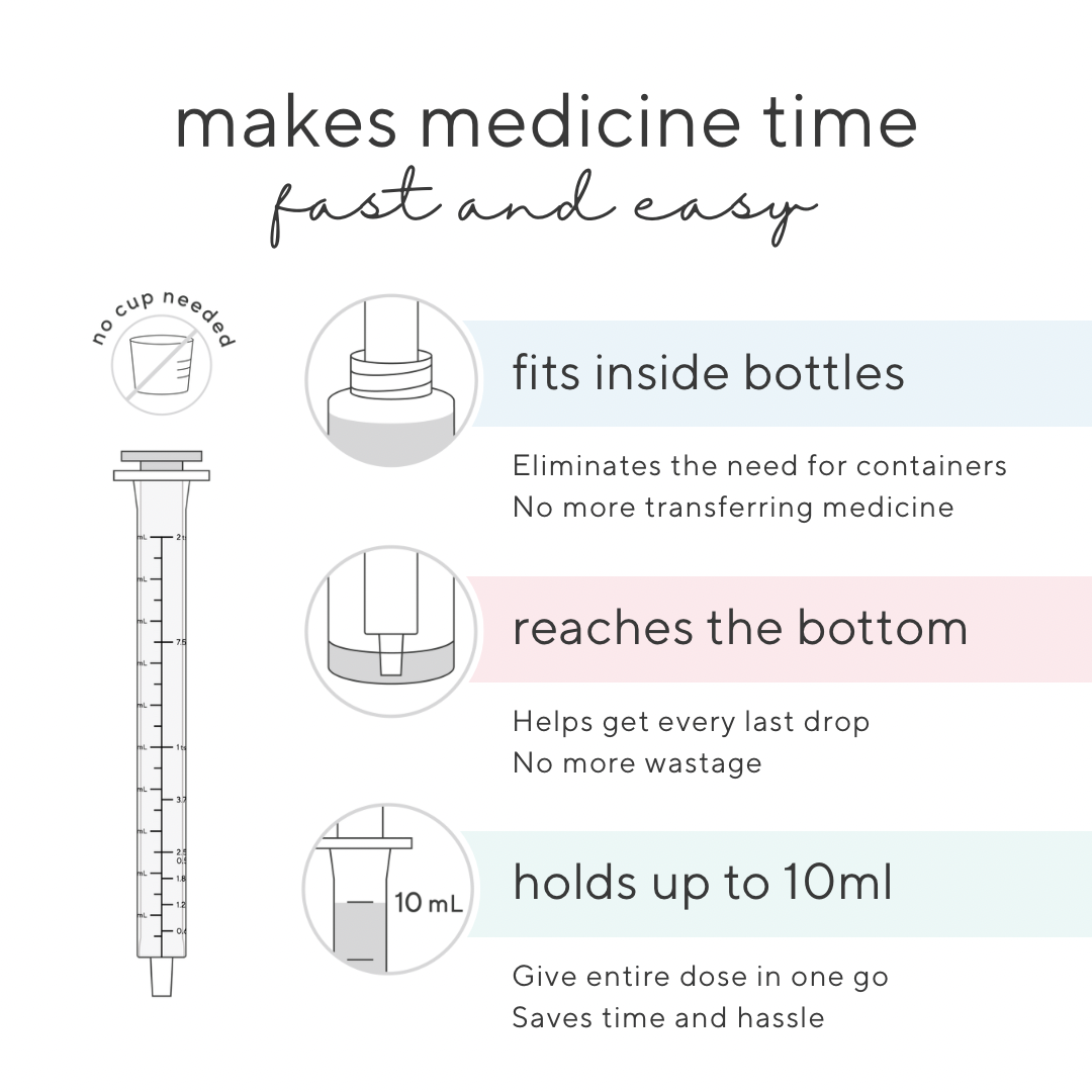 The Cutie Dose is the ultimate liquid dispenser for your family! It simplifies giving medication with its slim design; allowing the syringe to reach every last drop, eliminating the need for pouring and using multiple containers or bottle adapters. The 10mL capacity also reduces the need for multiple refills; the range of commonly used measurements makes it incredibly easy to administer medication accurately. Designed by parents for parents, to make medicine time a breeze!