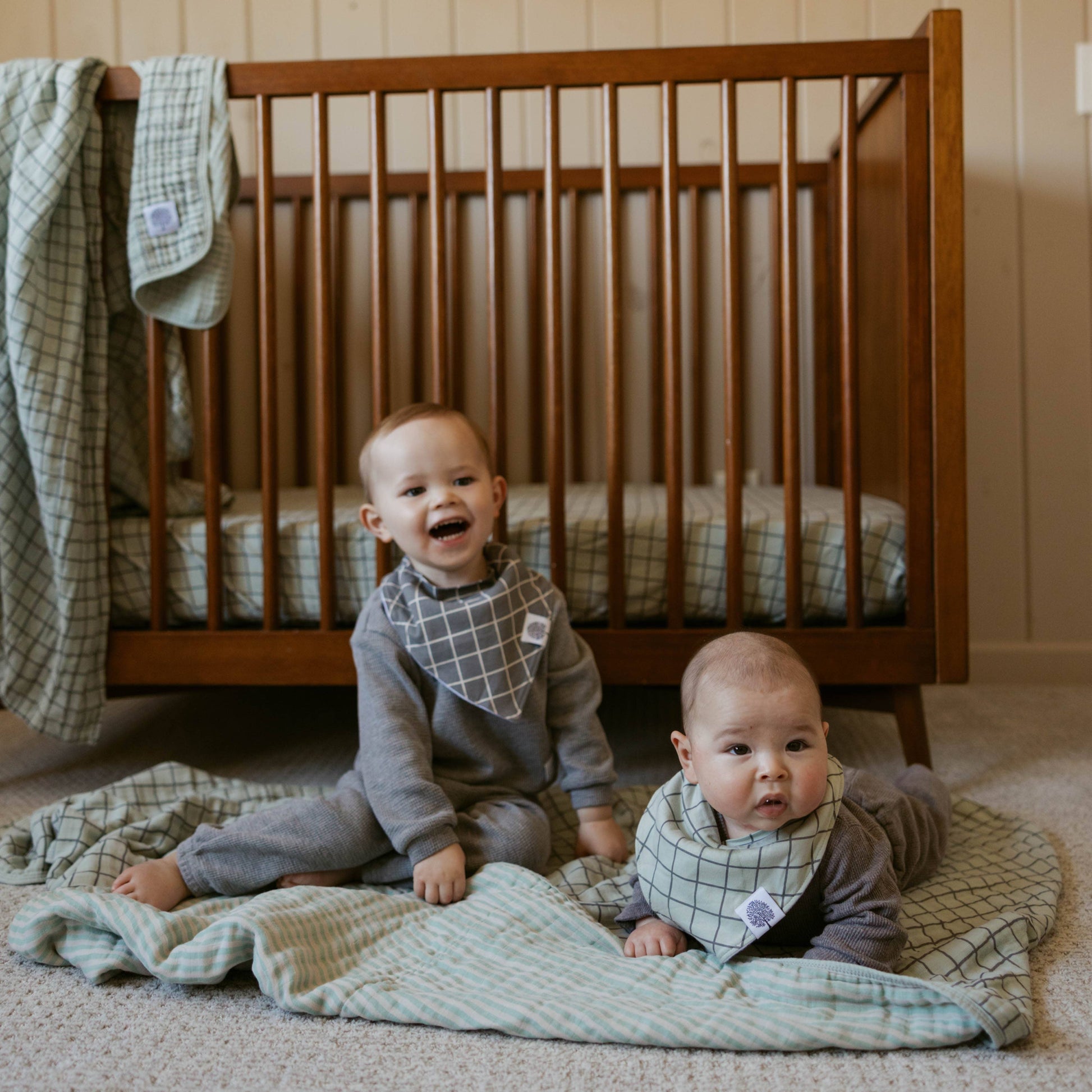 The Sage Windowpane Quilt makes a perfect baby shower gift. It's high quality, neutral, and blends with any nursery decor.