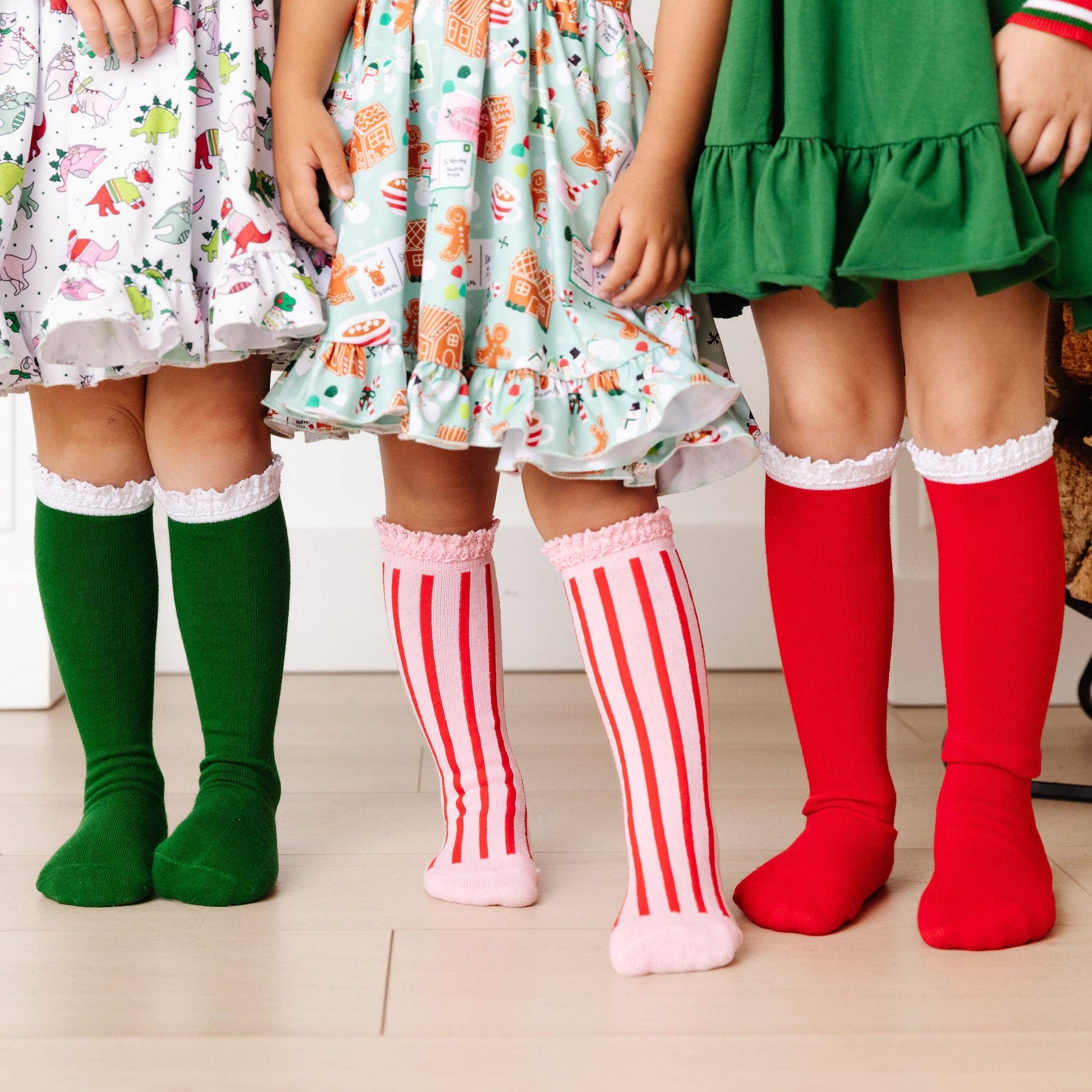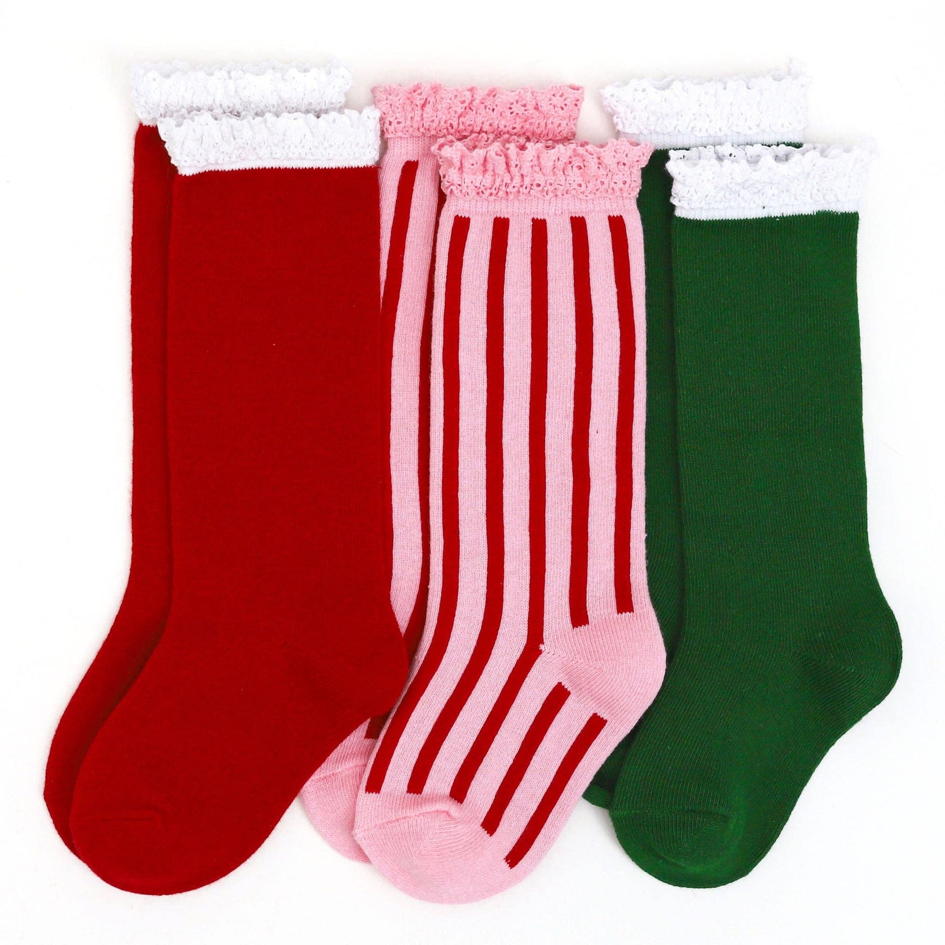 Santa Baby Knee High Sock 3-Pack Knee Highs are meant to hit just below the knee. Slight variations in sock length are normal. Machine wash cold with like colors. Tumble dry low or lay flat to dry. 79% cotton / 19% polyester / 2% spandex Imported.