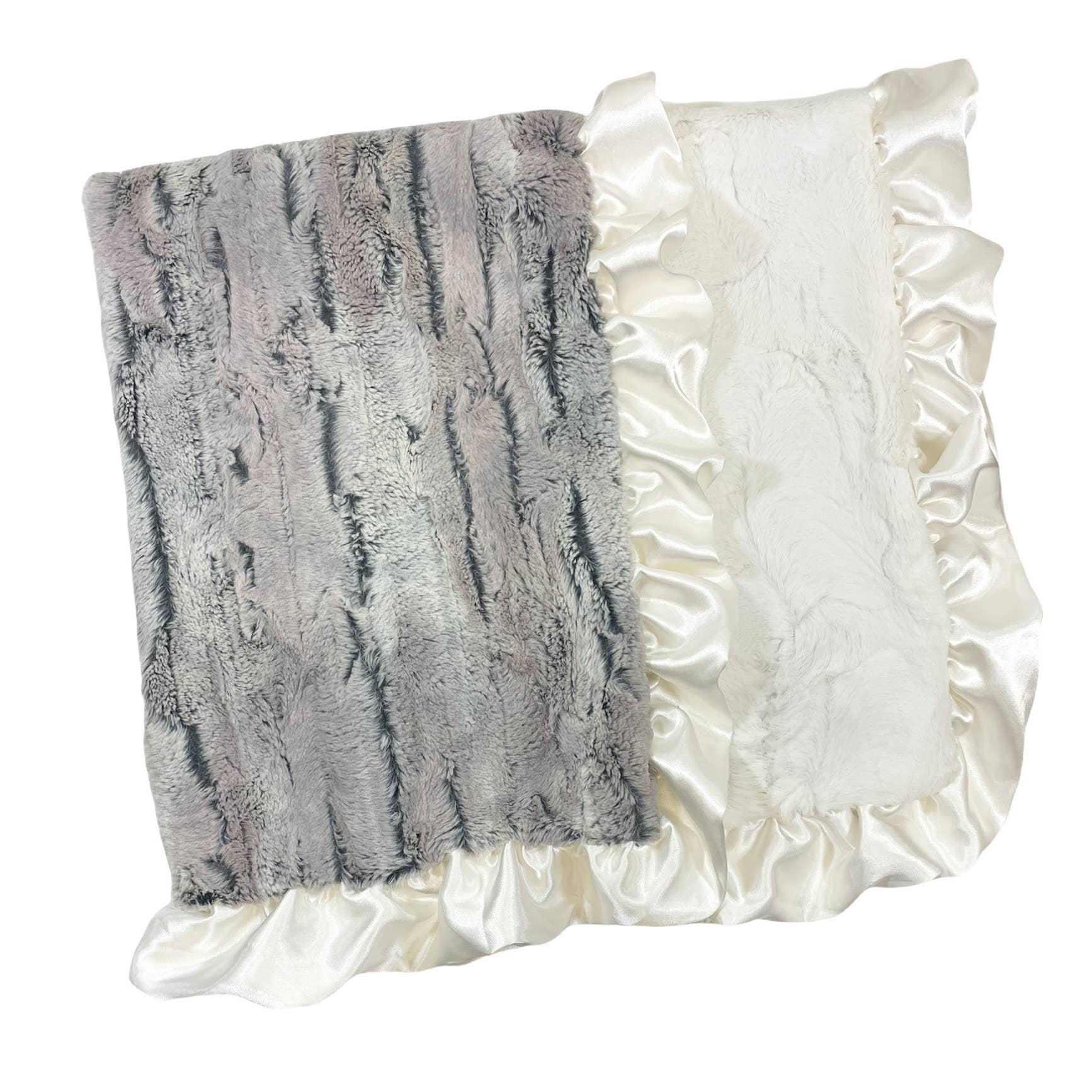 This luxurious plush blanket is framed with a silky satin ruffle. It measures approximately 34" x 34" and is made in the USA.