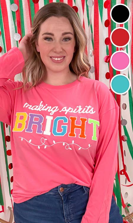 Soft Letter Patch Chenille graphic long sleeve design features MAKING SPIRITS BRIGHT with Christmas lights underneath. Making spirits is in white vinyl with BRIGHT in multicolored letters, stacked onto 3 lines. This top is perfect for the Christmas season!