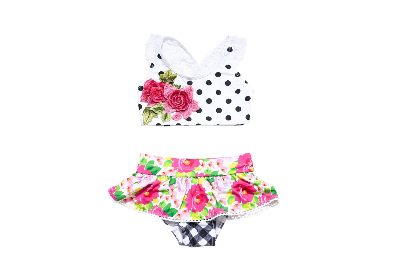 Size up for the best fit. *** Size 2t will fit an infant (6m-18m) *runs small *** Sizes 4t and under have ONE flower applique on the swimsuit top. *** Sizes 5y and higher have TWO flower appliques on the swimsuit top. Make a splash this spring and summer season with our Swimwear Collection. All swimsuits feature feminine, bright and youthful prints in fresh silhouettes. You can expect the following from our Swimwear Collection: -Soft and Comfortable Fit - Chlorine Resistant - UV Protection - Launders with Ease - Quick Drying Fabric - Durable and Resistant to Shrinkage - Abrasion/Pilling Resistant
